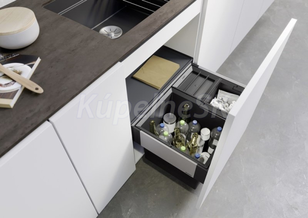 voliteľne dostupné: praktické príslušenstvo ako veko na nádoby, SELECT clip držiak pre vrecia na odpadky, elektrický otvárací systém BLANCO SELECT AutoMove alebo nožný výsuv BLANCO MOVEX