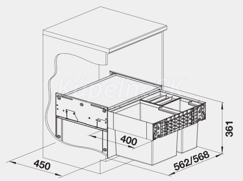 Výška zabudovania 361 mm, hĺbka zabudovania 400 mm, nutný vnútorný rozmer pre pojazdy 450 mm.