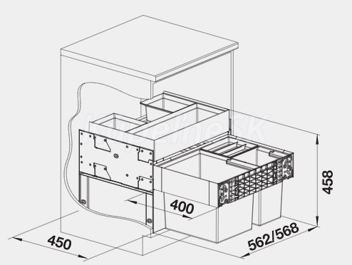 Výška zabudovania 361 mm, hĺbka zabudovania 400 mm, nutný vnútorný rozmer pre pojazdy 450 mm.