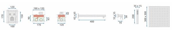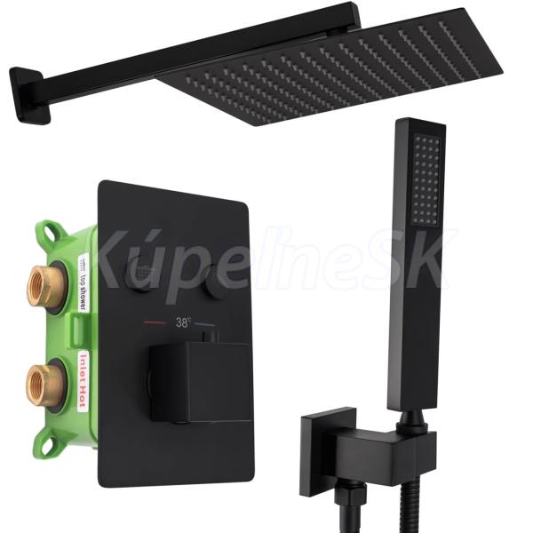 V sete je štvorcová sprcha s jemným odtokom o stranách 30 cm, batéria s povrchovými aj podomietkovými prvkami, hadica so sprchou a bodovým setom.