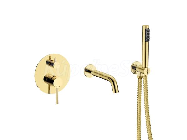 Jedinečný 3-otvorový podomietkový set s príslušenstvom VEO zlatá lesklá farba . Kompletné riešenie pre vašu vaňu. Set obsahuje podomietkovú batériu, vývod zo steny s držiakom, ručnú sprchu a hadicu . Batéria je dodávaná vrátane podomietkového modulu , ten výrazne uľahčuje montáž. Dodávame v šiestich farbách chróm, čierna, grafitová, zlatá, zlatá brúsená a zlatá lesklá.