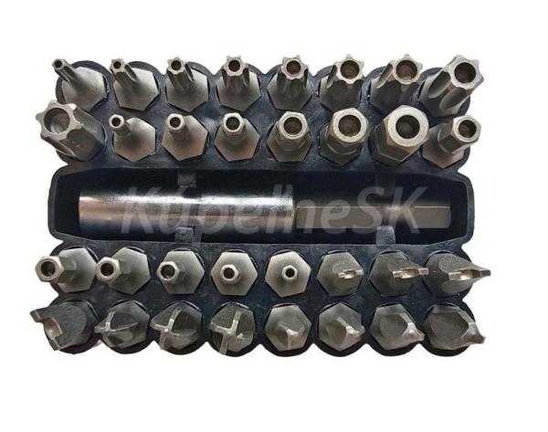 sada bitů + magnetický nástavec v plastovém držáku - 33 ks všechny díly vyrobeny z oceli S2 (5030) sada bitů je kolekce různých nástavců (bitů), které jsou určeny k použití s ručními nebo elektrickými šroubováky tyto bity se používají k utahování nebo p