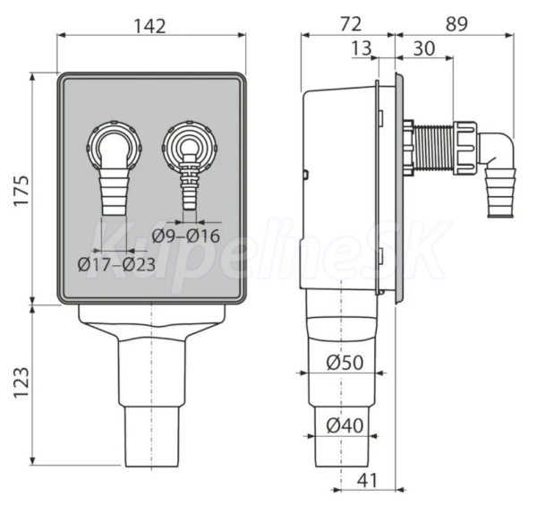 Alcadrain podomietkový práčkový sifón pre 2 spotrebiče, nerez DN40 a DN50