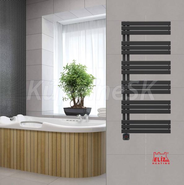 ELÍZ EBR 800 AG-B Elektrický radiátor, príkon 800 W, čierna matná farba, zabudovaná ohrievacia tyč, elektronické ovládanie teploty, krytie IP44, LED displej, časovač, automatické vypnutie pri prehriatí. SYMETRICKÝ DIZAJN – Elektrický radiátor ELÍZ, model EBR 800 AG-B Jeho nádherný symetrický dizajn plochých lamiel dodá vašim obytným priestorom moderný vzhľad.Model EBR 800 AG-B je priekopníkom symetrického dizajnu, ktorý ponúka jednoduché používanie, jednoduché čistenie a možnosť používať ho bez potreby akéhokoľvek ďalšieho príslušenstva. Elektrický radiátor EBR je tradičné riešenie pre vykurovanie a sušenie uterákov, ktoré je nezávislé od prívodu vody z centrálneho vykurovania. Koncepcia dizajnu BLACK & WHITE. Model EBR 800 AG ponúkame vo farbe: EBR 800 AG-W - biela lesklá, alebo EBR AG-B - čierna matná. Elektrický radiátor EBR 800 AG-B poskytne komfortný zdroj tepla pre vašu kúpeľňu a zaujme moderným dizajnom. Výkon elektrického telesa 800 W pohodlne vyhreje kúpeľňu do 10 m2 a viete ho využit aj ako praktický sušiak uterákov. Radiátor je vybavený dotykovým ovládacím panelom s LED displejom. Splňa normy na energetickú účinnosť ohrevu. Pomocou dotykového ovládania viete jednoducho nastaviť požadovanú teplotu a časovač. Nastavenie teploty sa vykonáva v rozsahu 5-30 °C. Radiátory série EBR sú dodávané so zabudovanou ohrievacou tyčou a naplnené nemrznúcou zmesou do -5°C. Súčasťou výrobku je taktiež prívodný napájací kábel s koncovkou na 230V. Radiátor je v rámci bezpečnosti vybavený automatickou ochranou proti prehriatiu. Výrobok je určený pre inštálaciu na stenu (držiaky na uchytenie na stenu sú súčasťou balenia).Pri prerušení a obnovení elektrického napájania sa zariadenie vypne a ostane v režime OFF (vypnuté). Vlastnosti: Výkon: 800 W Čierna matná farba Moderný dizajn plochých lamiel Krytie IP 44 - bezpečné použitie v kúpeľni Dotykový ovládací panel s LED displejom Presný elektronický termostat Nastavenie teploty 5 - 30 °C Časovač Protimrazová ochrana +7 °C Bezpečnostná poistka proti prehriatiu Jednoduché ovládanie Bezhlučná prevádzka Napájací kábel s koncovkou na 230V: 1,2 m