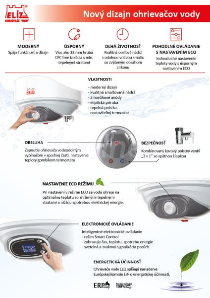 Nádrž ohrievača vody je vyrobená z kvalitnej ocele chránená vrstvou zirkónového smaltu. Kvalitná polyuretánová izolácia bez CFC hrúbky 33 mm zaručuje nízke tepelné straty a úsporu nákladov na ohrev vody. Pomocou termostatu umiestnenom na ovládacom paneli viete nastaviť teplotu vody v rozsahu 7 - 75°C, s možnosťou nastavenia režimu ECO. Pri nastevní v režime ECO sa voda ohreje na optimálnu teplotu 55°C, so zníženými tepelnými stratami a nižšou spotrebou elektrickej energie. Minimálna hodnota termostatu slúži ako ochrana proti zamrznutiu vody v ohrievači. Ohrievač má zabudované dve anódové tyče, ktoré garantujú efektívnu ochranu nádrže proti korózii a výrazne predlžujú jej životnosť. Vypínač so svetelnou kontrolkou ohrevu slúži k zapnutiu / vypnutiu ohrievača v prípade našej neprítomnosti, čo umožňuje úsporu energie.