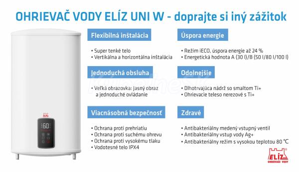 ELÍZ UNI 100 W Elektrický plochý ohrievač vody s WIFI, univerzálna montáž, objem 93 lit., 2 nádrže, 2 ohrievacie telesá, LED displej, nastaviteľný termostat, energetická trieda B, smaltovaná oceľová nádrž. Elektrický tlakový ohrievač vody ELÍZ UNI 100 W je vyhotovený v plochom prevedení s konceptom dvoch nádrži. Každá nádrž je vybavená samostatným ohrievacím telesom. Je určený pre zvislú alebo vodovorovnú montáž a je vhodný pre jedno alebo viac odberných miest. Hĺbka ohrievača je len 295 mm. Nádrž ohrievača vody je vyrobená z kvalitnej ocele chránená vrstvou zirkónového smaltu. Kvalitná polyuretánová izolácia zaručuje nízke tepelné straty a úsporu nákladov na ohrev vody. Ohrievač má zabudované dve anódové tyče, ktoré garantujú efektívnu ochranu nádrže proti korózii a výrazne predlžujú jej životnosť. Termostat umiestnený na ovládacom paneli umožňuje nastavenie optimálnej teploty vody v rozsahu 30 - 75 °C, ako aj nastavenie ECO teploty. Aktuálna teplota vody ako aj nastavená teplota sa zobrazuje na LED displeji. Ovládanie ohrievača aj cez aplikáciu WIFI. Súčasťou balenia ohrievača sú závesné konzoly na stenu, kovový poistný ventil so spätnou klapkou, napájací kábel a skrutky na uchytenie ohrievača. Hlavné výhody a vlastnosti: Ploché prevedenie, hĺbka len 295 mm Koncept dvoch nádrží Univerzálna montáž Veľmi rýchly ohrev vody Prepínateľný výkon 1,2 kW a 2 kW 2 samostatné ohrievacie telesá Energetická trieda B LED displej zobrazujúci teplotu vody Nastavenie ECO teploty Kvalitná oceľová nádrž so zirkónovým smaltom Bezfreónová polyuretánová izolácia s vysokou hustotou Dvojitá anódová ochrana nádrže - 2 horčíkové anódy Termostat umiestnený na ovládacom paneli - rozsah 30 - 75 °C Dvojitá tepelná poistka proti prehriatiu Závesná konzola a kovový poistný ventil so spätnou klapkou súčasťou ohrievača Napájací kábel (dlhý 1,2m) a skrutky na uchytenie sú súčasťou balenia videonavod