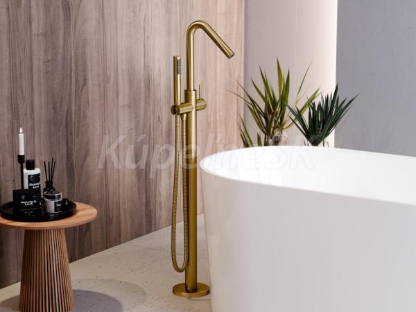Vysoká vaňová batéria VEO III v zlatej brúsenej farbe s výškou 1102 mm od európskeho dodávateľa vodovodných batérií BESCO . Batéria je určená na inštaláciu do podlahy (vrátane inštalačného boxu pre jednoduchšiu inštaláciu) a oceníte ju najmä ak máte voľne stojacu vaňu. Dodávané vrátane príslušenstva - sprchová hlavica s hadicou. Stojanková vaňová batéria pre moderné kúpeľne. Dodávame v piatich farbách a to chróm, čierna , grafitová, zlatá lesklá alebo zlatá brúsená.