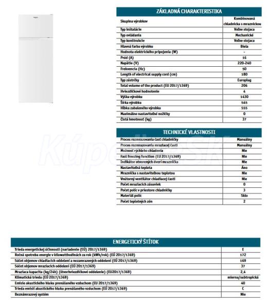 >>  Veľké spotrebiče  >>  Chladničky a mrazničky  >>  Whirlpool W55T0 412W voľne stojaca kombinovaná chladnička energ. tr. E Biela
