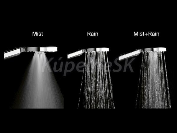 Sprchovú ružicu môžete prepínať medzi 3 funkcie. Funkcia Mist (hmla) vytvára drobné kvapky vody, ktoré pôsobia jemne, mäkko a relaxačne. Funkcia Rain (dážď) príjemne masíruje. V tretej funkcii Mist+Rain nájdete obe funkcie spojené.