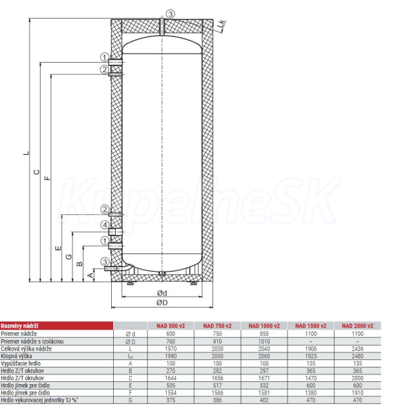 Skladovacie nádrže NAD sa vyrábajú s možnosťou usporiadania nátrubkov G 6/4“. Objímku G 6/4„ možno použiť na montáž elektrickej vykurovacej jednotky TJ 6/4“. Môže sa vyrábať aj s viacerými objímkami. Na požiadanie je možné zmeniť usporiadanie nátrubkov a počet nátrubkov. V štandardnom vyhotovení je objímka zaslepená. Zásobník je vhodný ako vyrovnávacia nádrž pre vykurovacie systémy s kotlami na tuhé palivo.