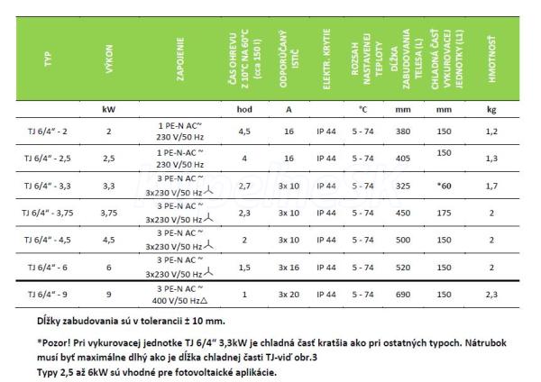 Elektrická závitová vykurovacia jednotka rady TJ je samostatné elektrické výhrevné zariadenie na vodu vybavené výhrevným telesom, prevádzkovým a bezpečnostným termostatom. Pripojuje sa na hrdlo so závitom G 6/4''. Výkon vykurovacieho telesa možeme voliť do výšky 9 kW, zapojenie 400 V. Termostat s vonkajším ovládaním umožňuje plynulé nastavenie teploty 0–80 °C. Využitie: Pomocný ohrev ohrievačov rady NTR/NTRR hlavne pri zapojení v solárnom systéme. Jednotka sa dá využiť na ohrev vody v iných zariadeniach pri dodržaní zásad v návode na použitie.