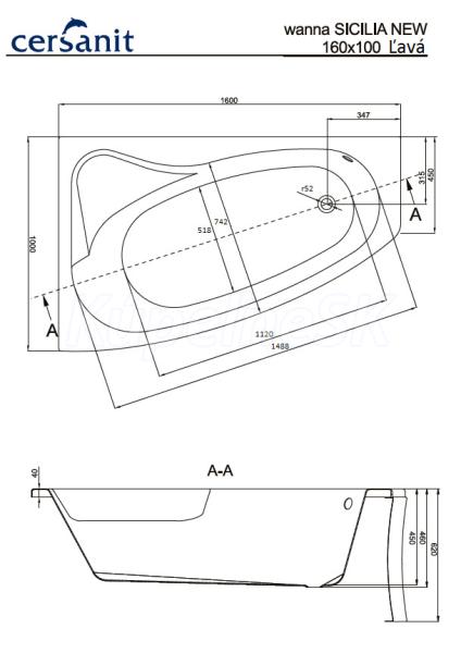 Cersanit SICILIA NEW Vaňa asymetrická 160x100 akrylátová, Ľavá a nohy, Biela S301-036 S301