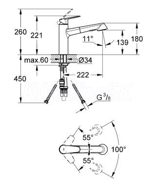 GROHE Eurodisc Cosmopolitan Páková drezová batéria,nízka vpusť,obmedzovač prietoku,chróm32