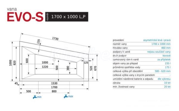Rozmery vane: 1700x1000mm Objem vane: 235 l