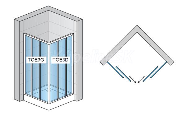 Ronal Top-Line TOE3D Sprchové dvere určené na kombináciu s druhými dverami TOE3G o ľubovoľnom rozmere, čím máte možnosť vytvoriť atypický rohový kút s rohovým vstupom. Trojdielne posuvné dvere, 3mm číre kalené bezpečnostné sklo. Plastové dieliky sú v chrómovanom prevedení. Magnetické tesnenie dverí zaručujúce tesnosť dverí.