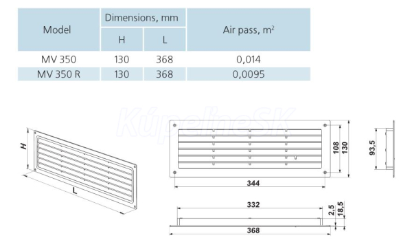 >> Obchod s inštalačným materiálom >> Ventilátory-mriežky-potrubia >> Ventilačné mriežky-Okná-krytky >> Ventilačná plastová mriežka, biela, MV350R-95x334