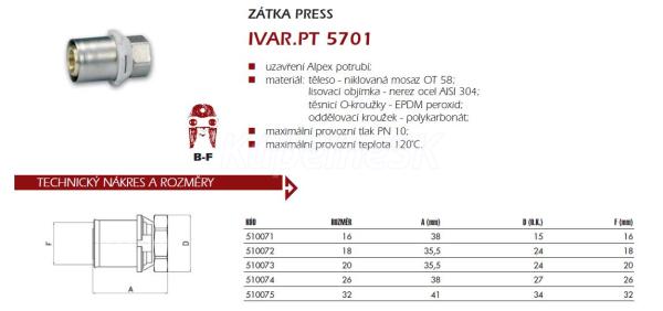 IVAR.PT 5701 Zátka PRESS pre uzavretie ALPEX potrubia, 18mm