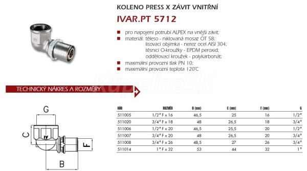 Koleno PRESS - závit vnútorný IVAR.PT 5712 Pre napojenie ALPEX potrubia na vonkajší závit materiál niklovaná mosadz OT 58, PN 10, T = 120°C, pre použitie: lisovacie kliešte B/F