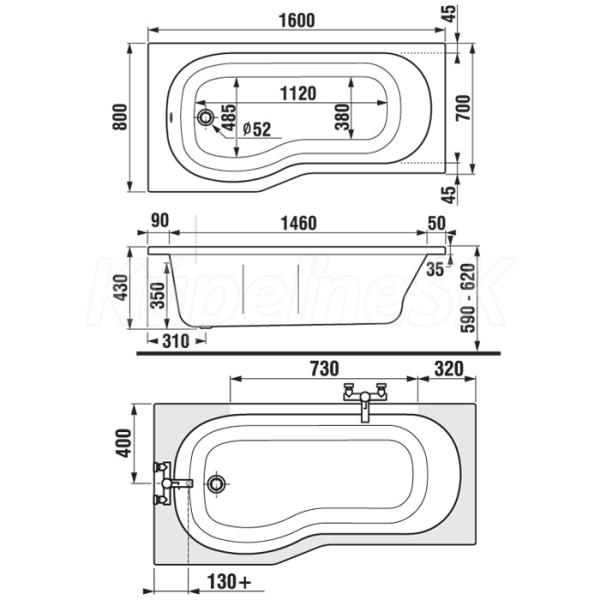 Vaňa asymetrická 160 × 80/70, pravá, vstavaná verzia, bez podpier