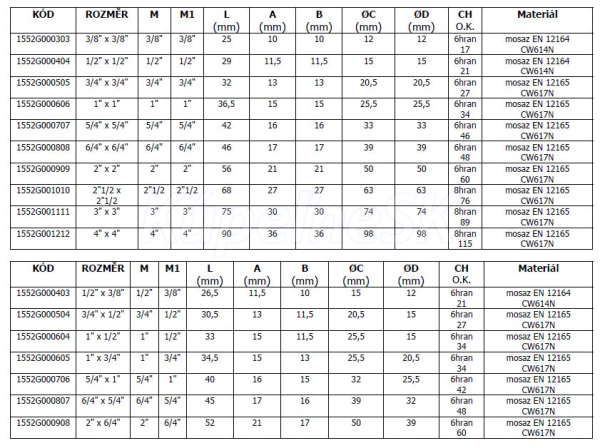vonkajší závit, PN 10, T = +120 °C, materiál mosadz OT 58,