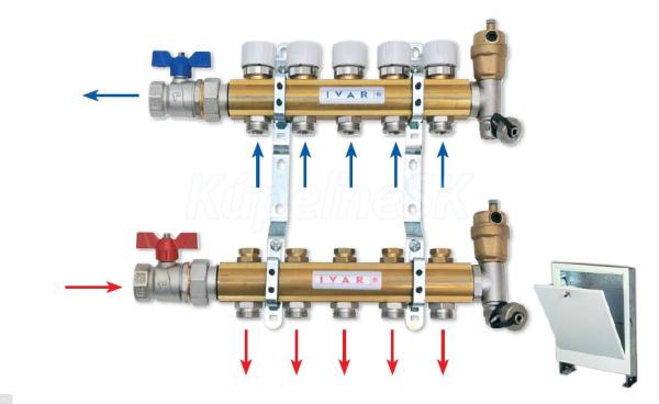 - zostava obsahuje: rozdeľovač s regulačnými šróbeniami, zberač s uzatváracími ventilmi, upevňovacie konzoly, 2 ks guľových uzáverov so šróbením, 2 ks ukončenia s automatickým odvzdušňovacím ventilom a otočným vypúšťacím ventilom, inštalačnú skriňu príslušnej veľkosti