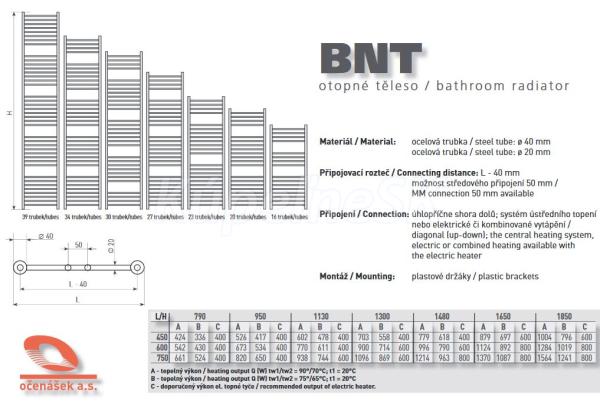 Možnost chrómového prevedenia. Opravný súčiniteľ na chrómovaný povrch fcr = 0,680. Radiátor je možné vyrobiť so stredovým pripojením 50 mm (za príplatok 20% k cene radiátora) alebo podľa požiadavkov zákazníka. BNT - klasické oceľové vyhrievacie teleso rady BNT s postrannými zvislými profilmi v tvare „O“ je ideálny pre vykurovanie chodieb, kuchýň, WC, kúpeľní a pod. Svojou konštrukciou sa výborne hodia k sušeniu a predhrievaniu ručníkov, utierok a iných textílií. Za týmto účelom môžu byť vybavené elektrickou vyhrievacou tyčou a T-kusem pre kombinované vykurovanie (viď doporučený el. príkon). Materiál: oceľová trubka 40 x 1,5 mm oceľová trubka O 20 mm Pripojovacia rozteč: L - 40 mm Pripojenie: systém ústredného vykurovania alebo na elektrické či kombinované vykurovanie Špecifikácia výrobku: vyhrievacie oceľové trubkové telesá sú určené k vykurovaniu v individuálnej i hromadnej bytovej zástavbe s núteným alebo samobežným obehom. Maximálny pracovný pretlak 1.0 MPa. Maximálna pracovná teplota 110 °C Odporúčanie: • použitie v prostredí +2 °C až + 45 °C • relatívna vlhkosť 65 % • v prípade využitia vykurovacieho telesa k sušeniu textílií je nutné používať príslušenstvo k tomu určené (madlo). Predchádza sa tak poškodeniu povrchovej úpravy telesa. V cene radiátora je držiak, zátka a odvzdušňovák. Upozornenie: Obrázky môžu byť ilustračné!!!