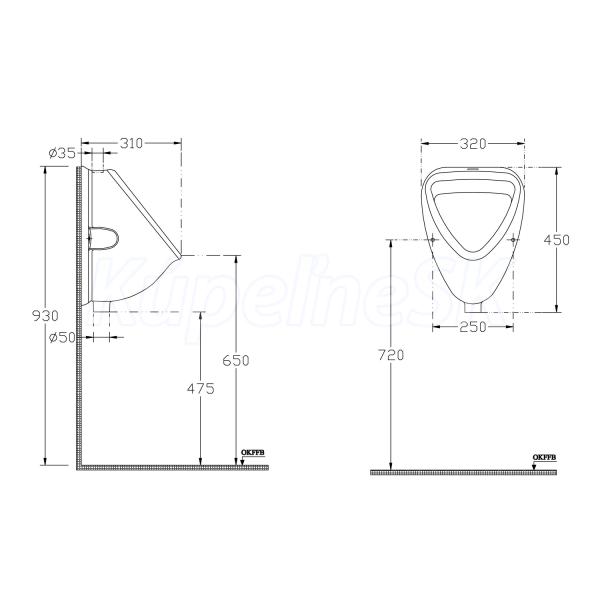 Aqualine Pisoár 45x31cm, horné napúšťanie, odpad zo spodu, bez sifónu