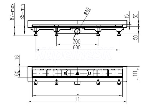 Minimálna stavebná výška je 65 mm a žľab je výškovo nastaviteľný. Pripojenie na kanalizačné
