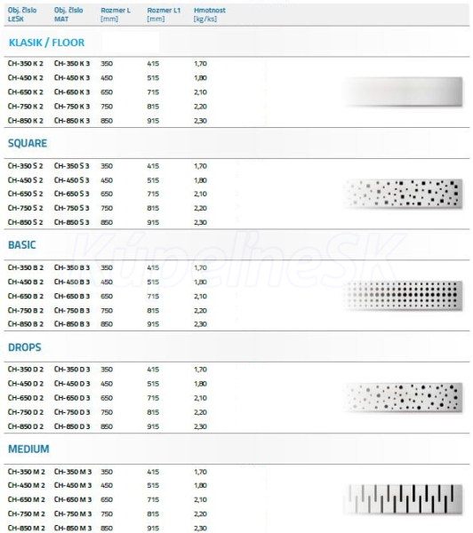 CHUDEJ, KLASIK/FLOOR Podlahový lineárny plastový žľab ku stene 750 mm, matný+rošt