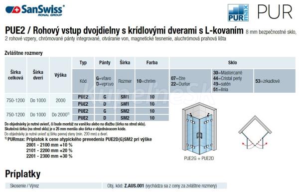 Sprchové kúty PUE2 sú tvorené dvojdielnym rohovým vstupom s dvoma krídlovými dverami a L-kovaním pre pripevnenie na steny. Dvere sú vybavené integrovanými chrómovanými pántami s otváraním von. Štandardne sú dodávané pánty hranaté, oblé pánty je možné dodať na objednávku. Sprchové kúty PUE2 sú vyrobené z kvalitného bezpečnostného 8 mm silného skla s antiplakovou úpravou Aquaperle. Magnetické tesnenie spolu s 5 mm aluchrómovou prahovou lištou zaručuje tesnosť dverí a dve rohové stabilizačné vzpery zvyšujú pevnosť konštrukcie.