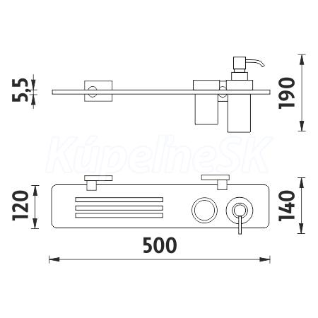 Polička s frézovanými otvormi+poháriky+dávkovač na tekuté mydlo