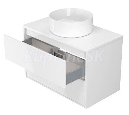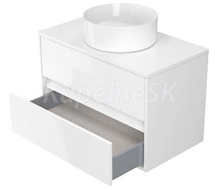 Závesná umývadlová skrinka v bielom prevedení. Korpus a predná časť skrinky je vyrobený z drevotrieskovej dosky. Skrinka má dve zásuvky s funkciou SoftClose- pomalé zatváranie.