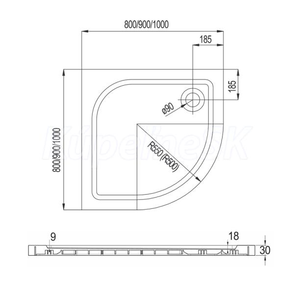 Štvrťkruhová sprchová vanička s dlhou životnosťou, liaty mramor, bez nožičiek, gelcoat.