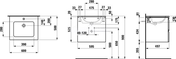 Laufen Pro skrinka s 2 zásuvkami s umývadlom slim s otvorom pre batériu v strede, glazovaný okraj umývadla