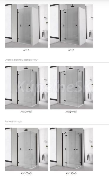 Sprchové dvere použiteľné ako dvere do niky (s doplnkovým stenovým profilom), alebo tvoriace jednu stranu štvorcového / obdĺžnikového sprchového kútu s čelným (kombinácia s pevnou stenou ANT) alebo s rohovým vstupom (kombinácia s ďalšími dverami AN1C).