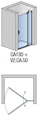 Obojstranne jednkrídlové dvere s krátkou pevnou stenou v rovine na strane pántov do niky/sprchového kúta s čelným (kombinácia s pevnou stenou CAT1 / CAT3) alebo s rohovým vstupom (kombinácia s ďalšími (opačnými) dverami CA13), prípadne tvoriace čelný vstup trojstranného sprchového kúta (kombinácia s pevnými stenami CAT1 a CAT3).
