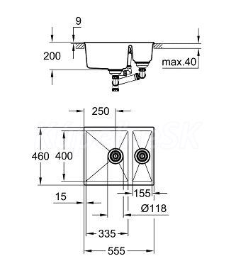 veľkosť sektora drezu: 335 x 400 x 200 mm, veľkosť 1/2 sektore drezu: 155 x 400 x 140 mm