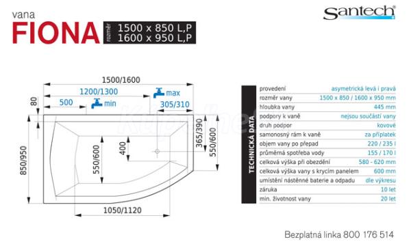 Rozmery vane: 1500x850mm Objem vane: 220 l nutný predĺžený sifón