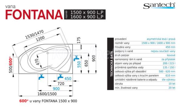 Najväčšou prednosťou asymetrické vane Fontána je jej "úsporná šírka" 90 cm, preto sa stala veľmi obľúbeným modelom u projektantov. Akrylátová vaňa je vybavená stredovým prepadom a odtokom, čo je konštrukčné riešenie nie celkom bežné u výrobkov o dĺžke 150, resp. 160 cm. Táto špecialita môže byť pre niektorých záujemcov pri výbere vane veľmi dôležitá. Chrbtová oporná časť má veľmi pozvoľný sklon, ktorý prináša pohodlnú relaxáciu.