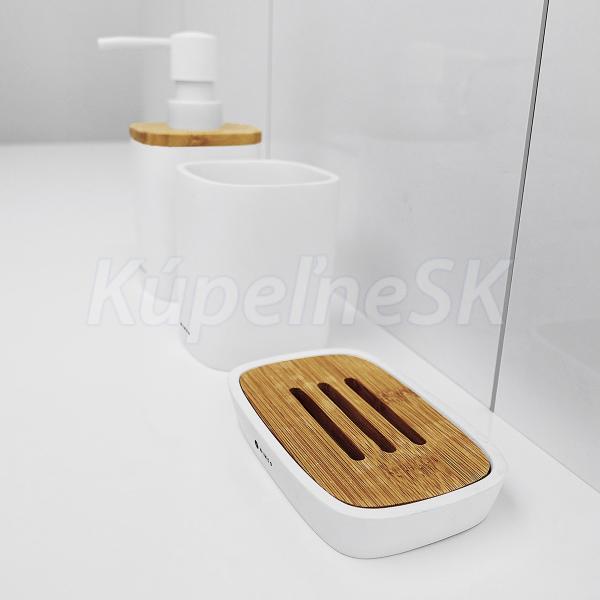 Dárkový set s dávkovačem, mýdlenkou a dózou na kartáčky. Materiál polyresin, bambusové dřevo.