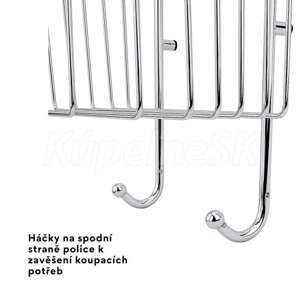 Závěsná police dvoupatrová je skvělým doplňkem do koupelny. Chcete mít svůj oblíbený šampon nebo sprchový gel při ruce, ale zároveň ho nechcete neustále lovit na zemi sprchového koutu? Pak jsou závěsné drátěné police ideálním řešením. V nabídce NIMCO naleznete dvoupatrovou nebo třípatrovou, takže se nemusíte bát, že se se do ní vše nevejde. Hluboké košíky zajistí, aby z nich přípravky nevypadávaly. Organizovanost a pořádek patří i do koupelny a s policemi NIMCO toho můžete hravě dosáhnout. Ve spodní části jsou dva praktické háčky určené k zavěšení mycí houby, kartáče apod. Díky vysoce kvalitní pochromované oceli mají police dlouhou životnost. V zadní části police jsou gumové výztuže pro idelální přilnavost ke sklu. Výztuže zabraňují poškození skla. Pryžová objímka na závěsných hácích chrání sklo i polici před poškozením. Tloušťka skla sprchového koutu pro zavěšení police max 25 mm.