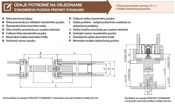 Vnútorná hrúbka (K) stavebného puzdra je 100 mm = dokončená priečka (P) = 125 mm. Alternatívna hrúbka (K) stavebného puzdra je 75 mm = dokončená hrúbka priečky (P) = 100 mm – platí iba pre priechodovú výšku 1970 mm.