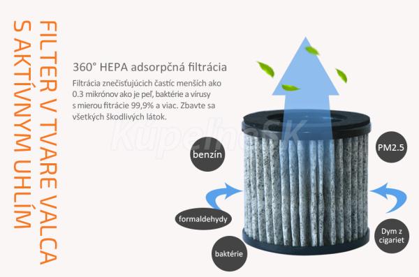 Tento malý zázrak filtruje prach a pevné nečistoty, peľ, baktérie, odstraňuje zápach, dym z cigariet a eliminuje formadelhydy. 360° cyklické hĺbkové čistenie vnútorného priestoru auta vám zabezpečí vysokú účinnosť čistenia a prinesie pohodu, ktorú určite ocení každý, najmä alergici. Čistička vzduchu do auta má zabudovaný účinný HEPA filter s aktívnym uhlím a pracuje na princípe adsorpčnej filtrácie vzduchu. HEPA filter vďaka svojej štruktúre z mikrovlákna s veľkosťou pórov 0,01 μm a s prímesou aktívneho uhlia dosahuje mieru filtrácie vzduchu viac ako 99,9%.