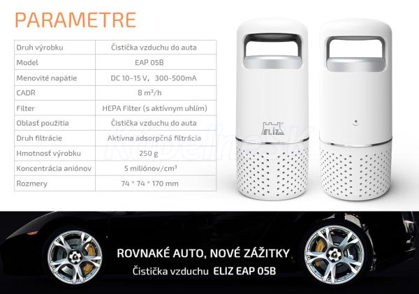 ELÍZ EAP 05B Čističky vzduchu | Čističky vzduchu Čistička vzduchu do auta, HEPA filter s aktívnym uhlím, 360° prívod vzduchu, ionizátor, CADR 8 m3/hod, napájací adaptér 12V Veľa ľudí sa zaujíma o kvalitu vzduchu, ktorý dýchajú v domácnosti. Avšak menej ľudí rieši kvalitu vzduchu v ich aute. Stále sa v aute vyrovnávate s týmito skrytými hrozbami, ako sú nečistoty, prach, peľ, zápach z klimatizácie, zápach výfukových plynov a pod.? Dýchajte prirodzene aj vo vašom aute! Vďaka čističke vzduchu ELÍZ EAP 05B, špeciálne navrhnutej pre autá, si doprajete čistý a svieži vzduch aj v aute počas ciest.