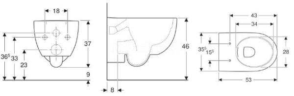Geberit Selnova Závesné WC Zvýšené 46cm, Rimfree 530x355mm Uzavretý tvar, Biele, oblé