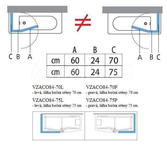 Celkový rozmer vaňové zásteny: 84 x 150 cm + bočná stena 70/75 x 150 cm