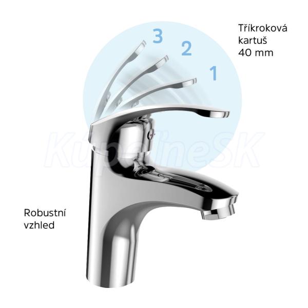 Oblý robustný design, trojkroková kartuša pre zníženú spotrebu vody.