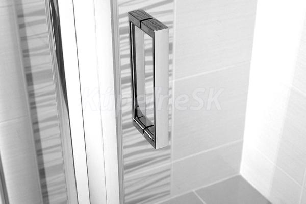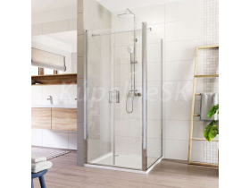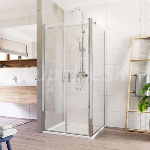 Hliníkové profily vo farbe chróm, lietacie dvere a pevný diel, sklo Číre, hrúbka skla 6 mm, štvorec, 1200 (dvere) x 1200 (pevný diel), výška 1900 mm.