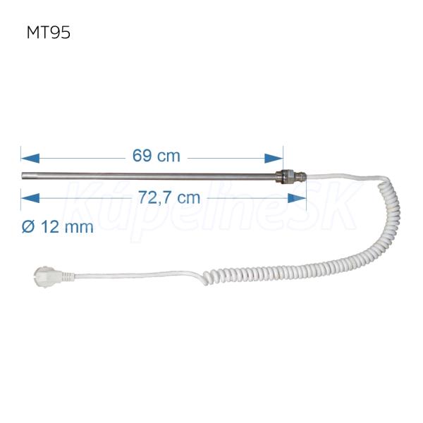 Elektrická vykurovacia tyč bez termostatu slúži k vyhrievaniu kúpeľňových radiátorov - rebríkov. Vykurovacia tyč po zapnutí telesa do zásuvky nemá žiadnu reguláciu ani termostat a hreje pokiaľ ju nevypnete. Termostat pod označením MT99 je možné zakúpiť samostatne. Dĺžka káblu u vykurovacej tyče je 120 cm a je zakončená vidlicou s ochranným kolíkom.