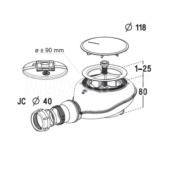 Samočistiaci sifón pre sprchové vaničky s odpadovým otvorom s priemerom 90 mm a s chrómovým vekom s priemerom 118 mm. Kĺbové pripojenie odtoku pre lepený či zásuvný spoj, s možnosťou viacsmerného umiestnenia výstupu vody v rozsahu 30 ° horizontálne a 20 ° vertikálne.